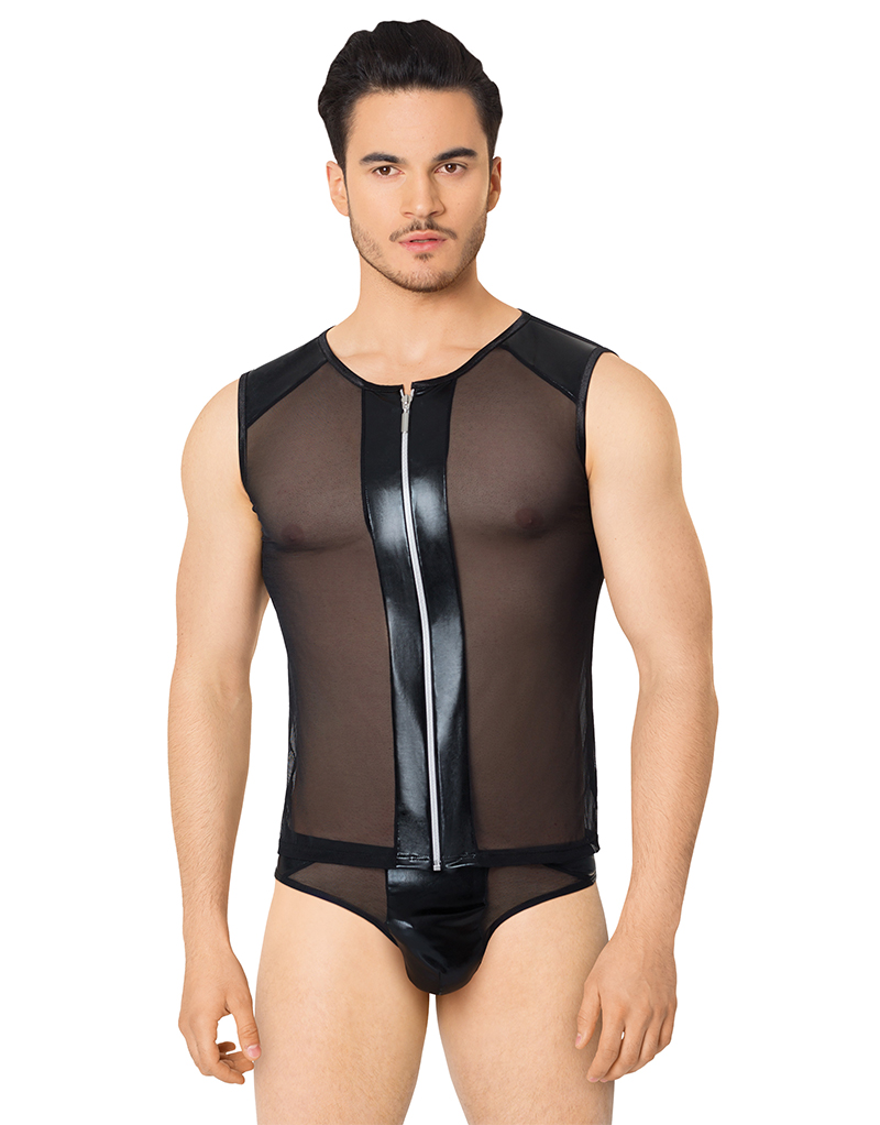 Komplet uključuje majicu bez rukava i tange Seksi muški set izrađen je od mekane elastične mreže u kombinaciji sa wet look neprozirnim materijalom Ručno prati u hladnoj vodi, ne izbjeljivati, osušiti kapanjem
